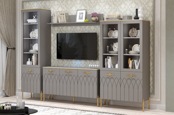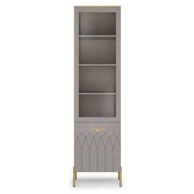 • Яркая фурнитура в цвете золото отличается надежностью и удобством эксплуатации, а также завершает эффектный образ витрины, расставляя акценты на фасадах.