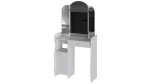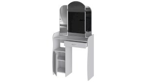 Помимо внешней привлекательности стол оснащен большим зеркалом с поворотными зеркальными створками, вместительную столешницу под которой располагается выдвижной ящик, открытая ниша для хранения и секция с дверцей, где можно разместить все необходимые аксессуары и косметику. Удобные отсеки помогут поддерживать порядок и удобство в Вашем уголке красоты.