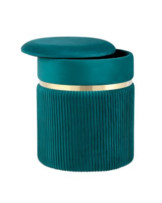 Лаконичная модель пуфа в обивке из мягкого велюра, которая дополнит интерьер вашего дома. Обивка красиво украшена декоративными оборками и металлическим ободком в золотом цвете. Под сиденьем имеется ящик для хранения различных мелочей. В основании предусмотрены специальные подпятники, которые делают пуф более устойчивым и предотвращают скольжение.