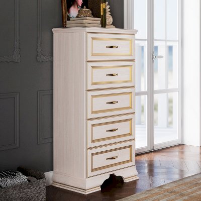 Классический стиль в мебели предполагает надёжную конструкцию с правильными и простыми геометрическими формами, а в качестве декора используются всевозможные элементы, такие как рельефные профили, массивные опоры и изысканная фурнитура. Цветовая гамма ЛДСП и МДФ «Бодега белый» сочетается с благородной золотой патиной и наполняет дом атмосферой тепла уюта. Последний штрих в образе классического комода - это лицевая фурнитура в виде металлических ручек цвета старая бронза.