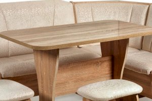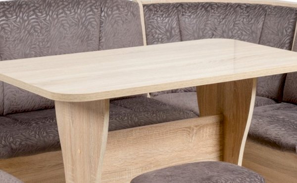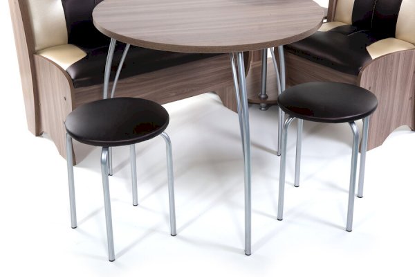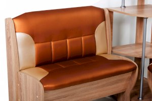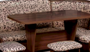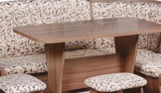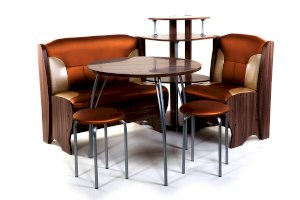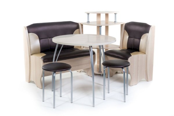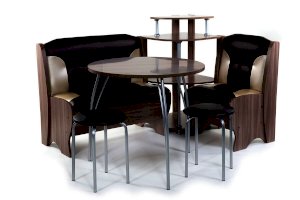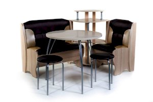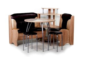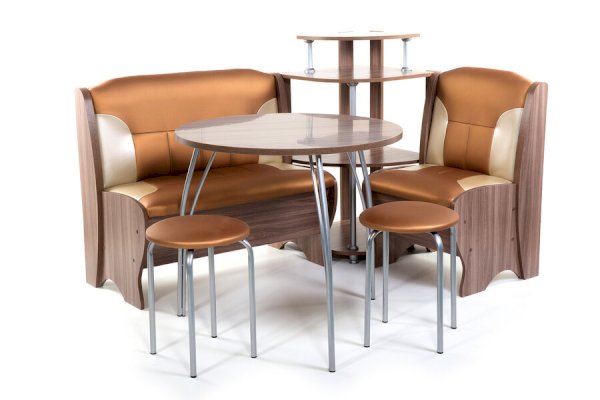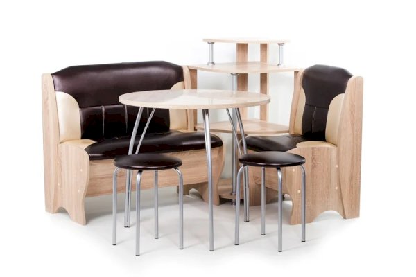 Оригинальный кухонный уголок Лотос отличается от других похожих кухонных гарнитуров. Он состоит из двух отдельных диванчиков и этажерки, заменяющей угловую мягкую часть. Круглый кухонный стол в отличие от других наборов мебели на металлическом основании как и два круглых табурета. Набор мебели для кухни включающий в себя большую прямую скамью,малую прямую скамью,угловую этажерку, стол на металлических ногах и два табурета на металлокаркасе. В прямых скамьях под сиденьями расположены ящики.