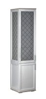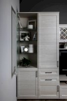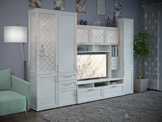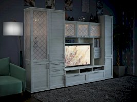 Витрина со стеклянной дверцей и боковиной, за которыми просматриваются полки и выставленные на них предметы. Стекло делает витрину визуально легкой, компактной, а всему помещению добавляет света и торжественности. Шкаф витрину можно использовать не только в сочетании с другими модулями гостиной, но и как отдельный предмет мебели.