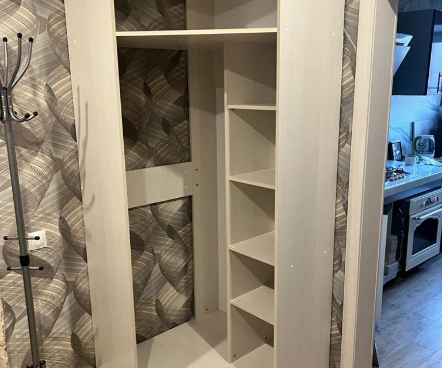 шкаф пошел по цвету, в тон дверей, светло серый,